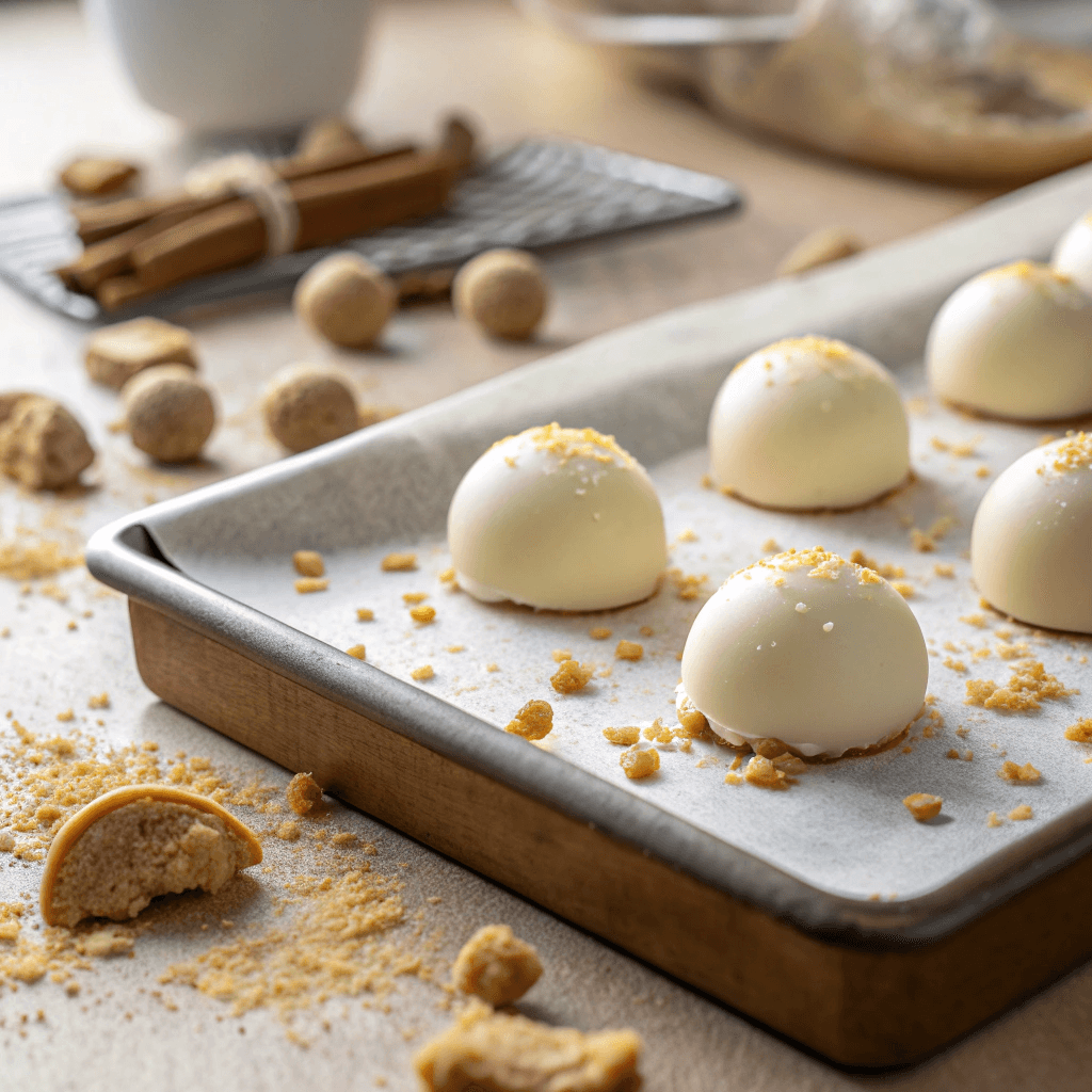 - Line a baking sheet with parchment paper. Using a small cookie scoop, roll the chilled mixture into 1-inch balls and arrange them on the prepared sheet.